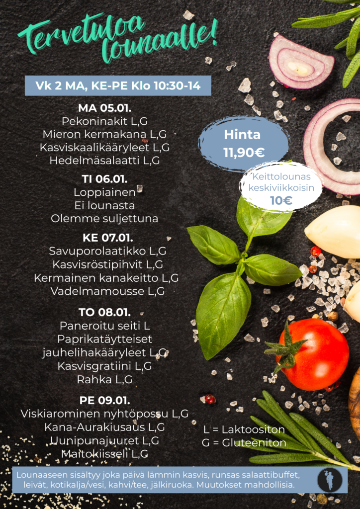 Tervetuloa kotiruokalounaalle ma-pe klo 10:30-14.