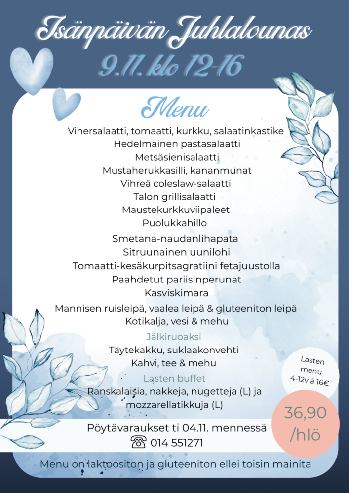 Isänpäivän juhlalounas Tervetuloa Mierontien Isänpäivän Juhlalounaalle! Pöytävaraukset ti 04.11. mennessä puh 014 551 271.